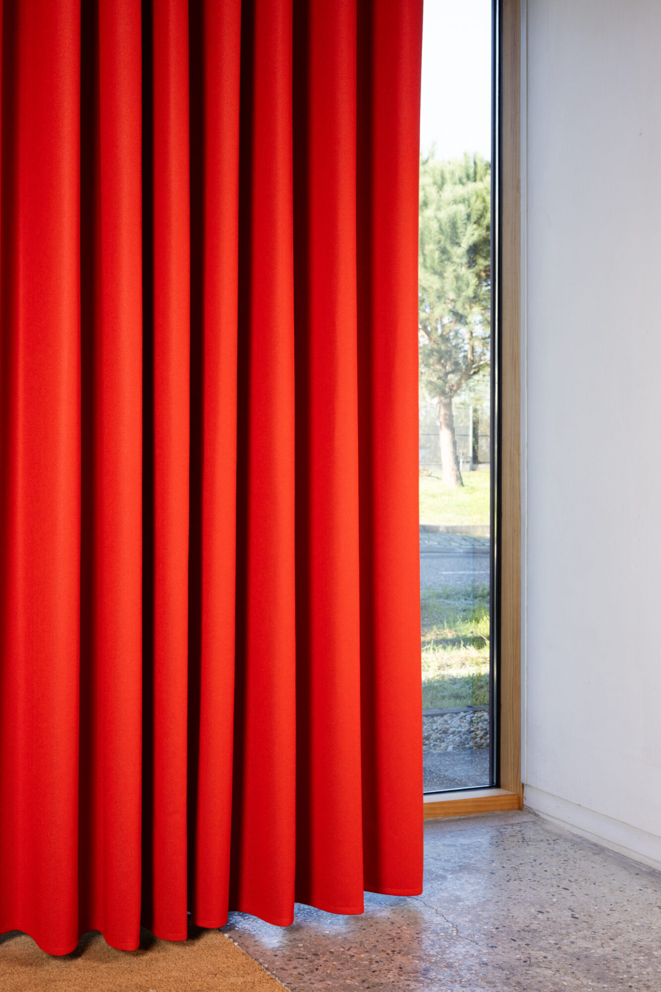 Highly flame-resistant, they are composed of two sides of run-resistant, anti-static Aeria fabric and two layers of 0.4 mm gray or black non-woven fabric. The curtain panels, finished with a hem at the bottom, are connected to each other by zippers integrated into their side finishes and matching the chosen color.