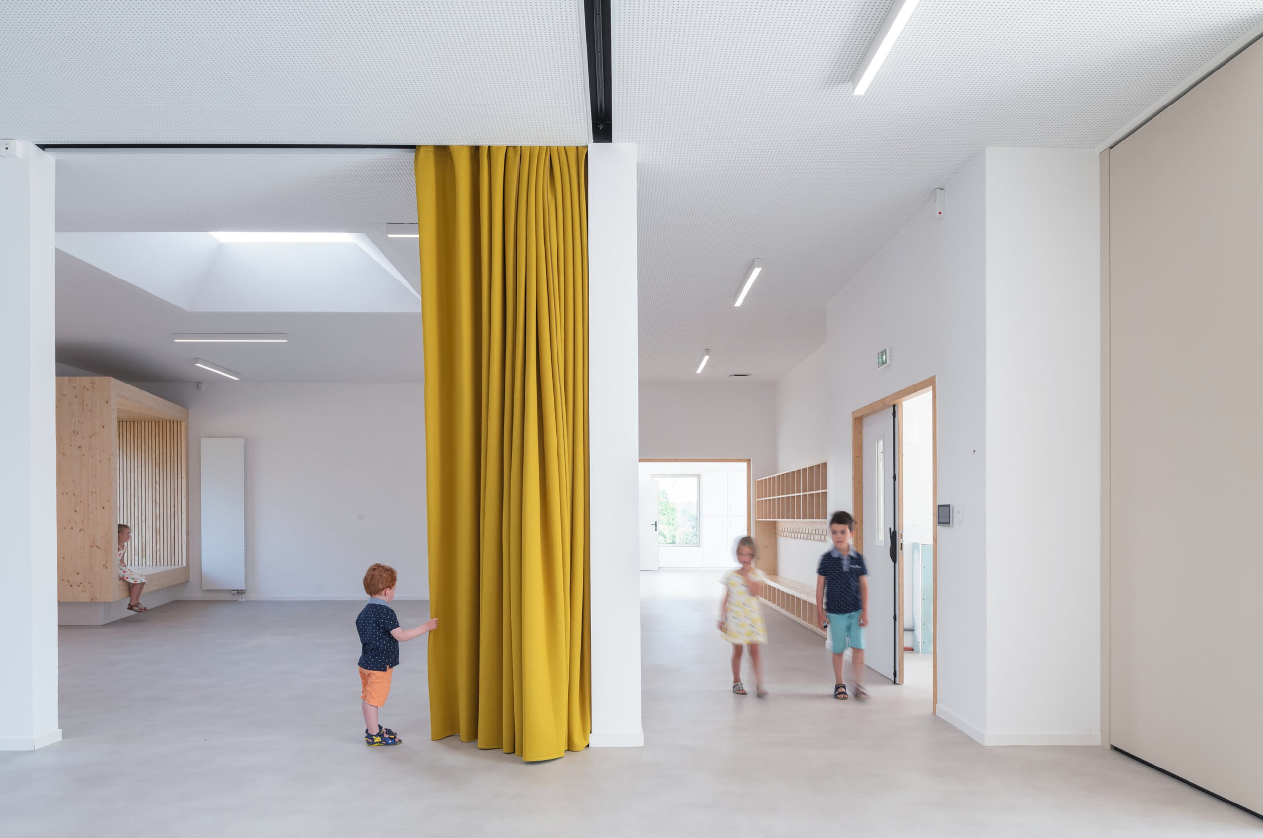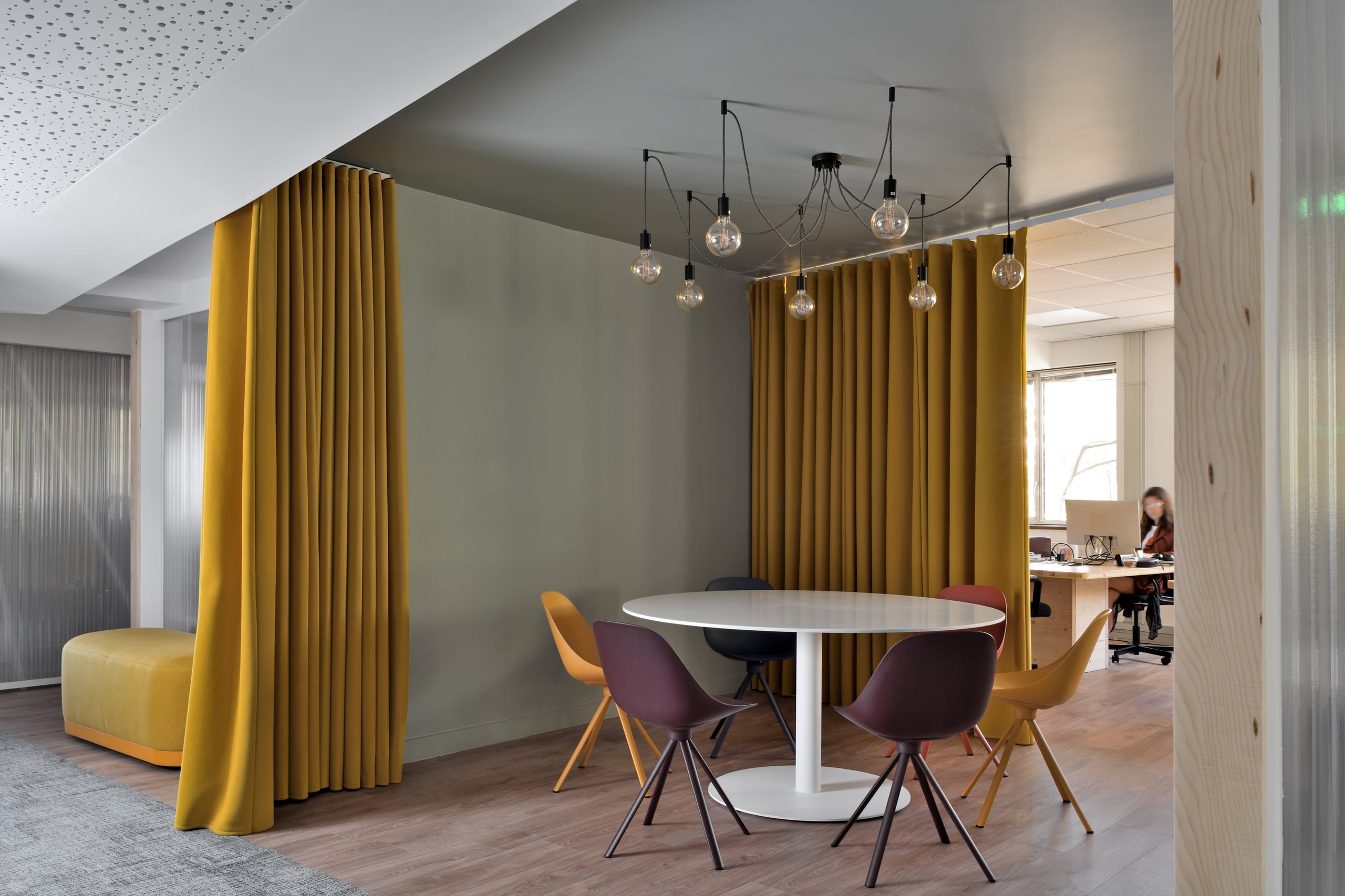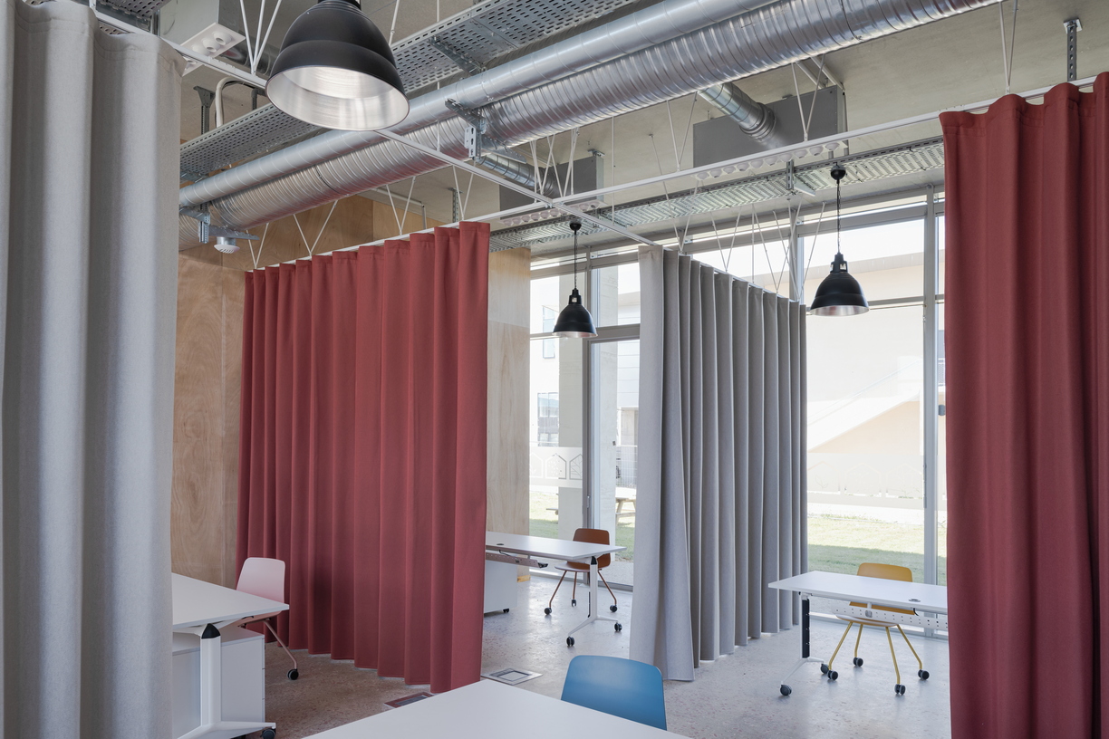 Sound absorption is provided by Texaa’s Velio acoustic curtains.